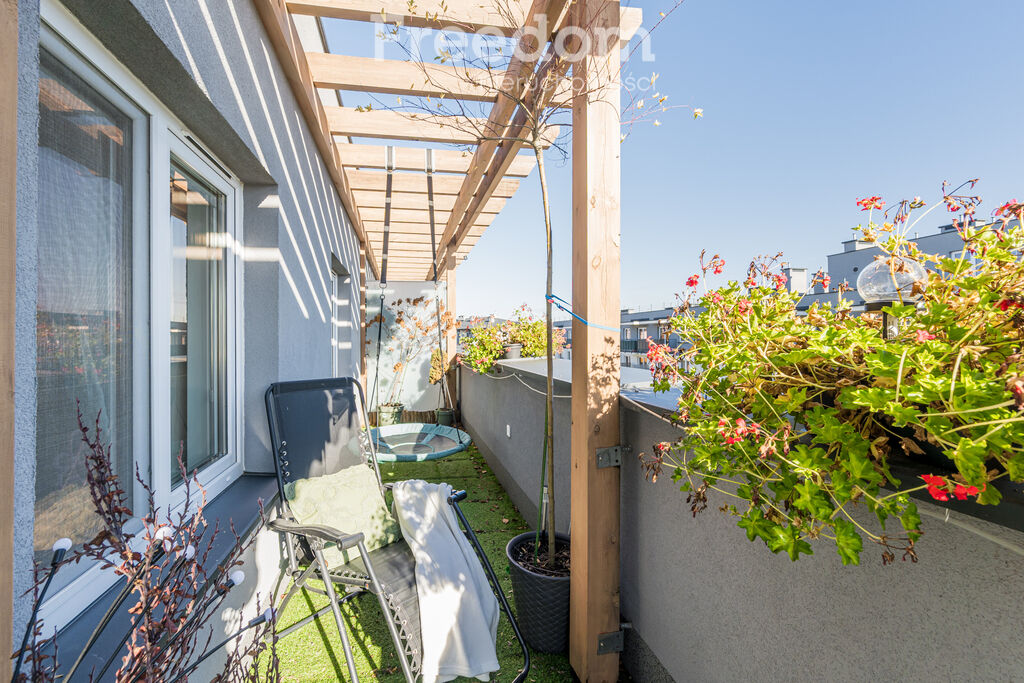 Jasne wnętrza, rozkładowy układ pomieszczeń, duży taras.